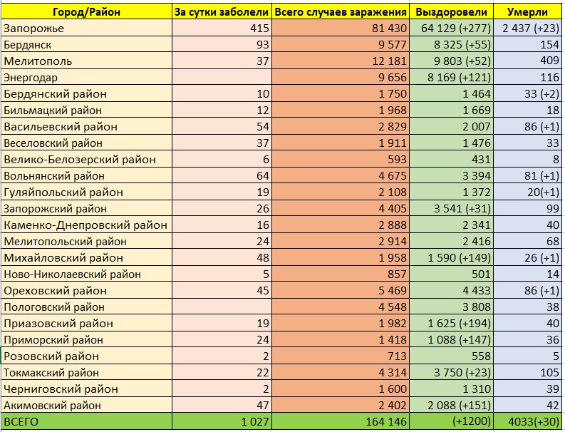 По информации запорожского областного центра контроля и профилактики болезней МОЗ, с начала пандемии в Запорожской области зарегистрировано уже 164 146 случаев коронавирусной инфекции. Из них 1 027 – за вчера.