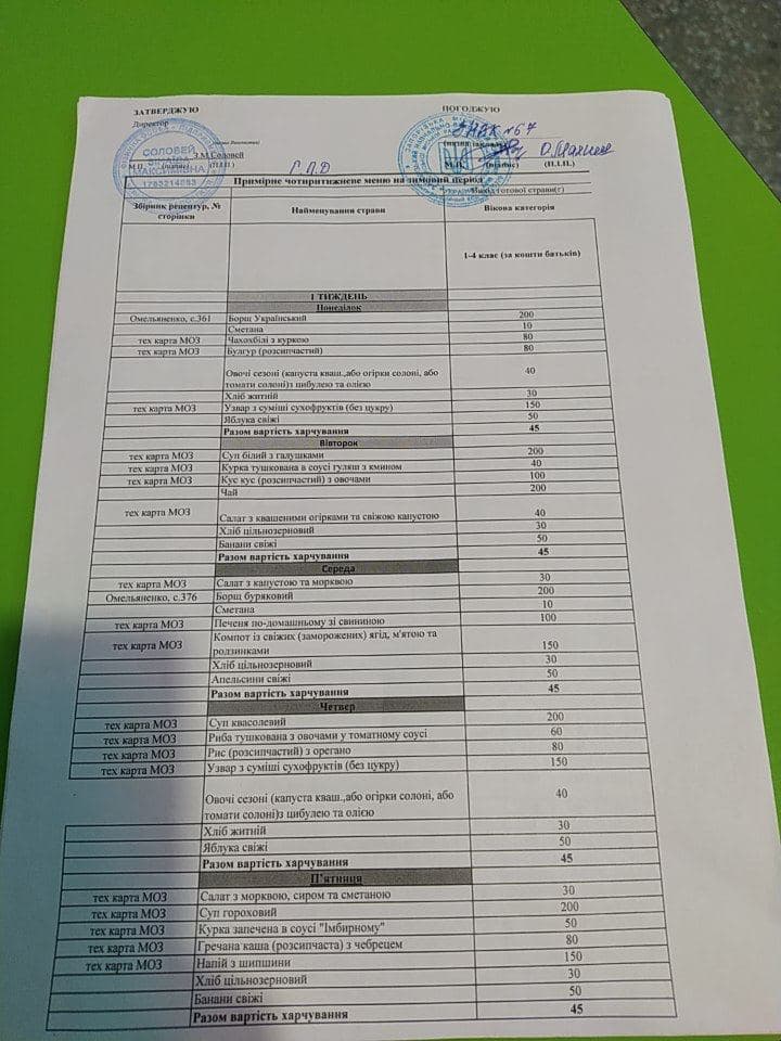 Также стоит отметить, что меню подорожало. Теперь за один день родителям придется платить по 45 гривен за 390 грамм комплексного обеда, состоящего из первого, второго (гарнир с мясом или рыбой), салата, хлеба, напитка (узвара, компота, шиповника) и фрукта. При том что ранее меню стоило в районе 30 гривен.