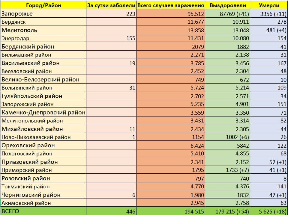 По информации запорожского областного центра контроля и профилактики болезней МОЗ, с начала пандемии в Запорожской области зарегистрировано уже 194 515 случаев коронавирусной инфекции. Из них 446 – за последние сутки.
