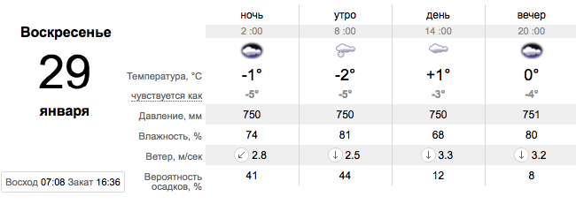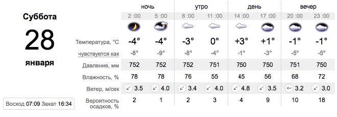 А вот в воскресенье, 29 января, с утра начнется небольшой снегопад. Санки, правда, можно не доставать – он быстро закончится и растает. Утром температура будет -2 градуса, днем поднимется до 1-го, вечером будет 0. Осадков больше не прогнозируют.