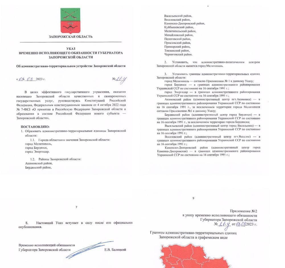 Так называемый "губернатор" Запорожской области Евгения Балицкого даже издал "указ". Согласно документу, тремя городами областного значения стали Бердянск, Мелитополь и Энергодар.