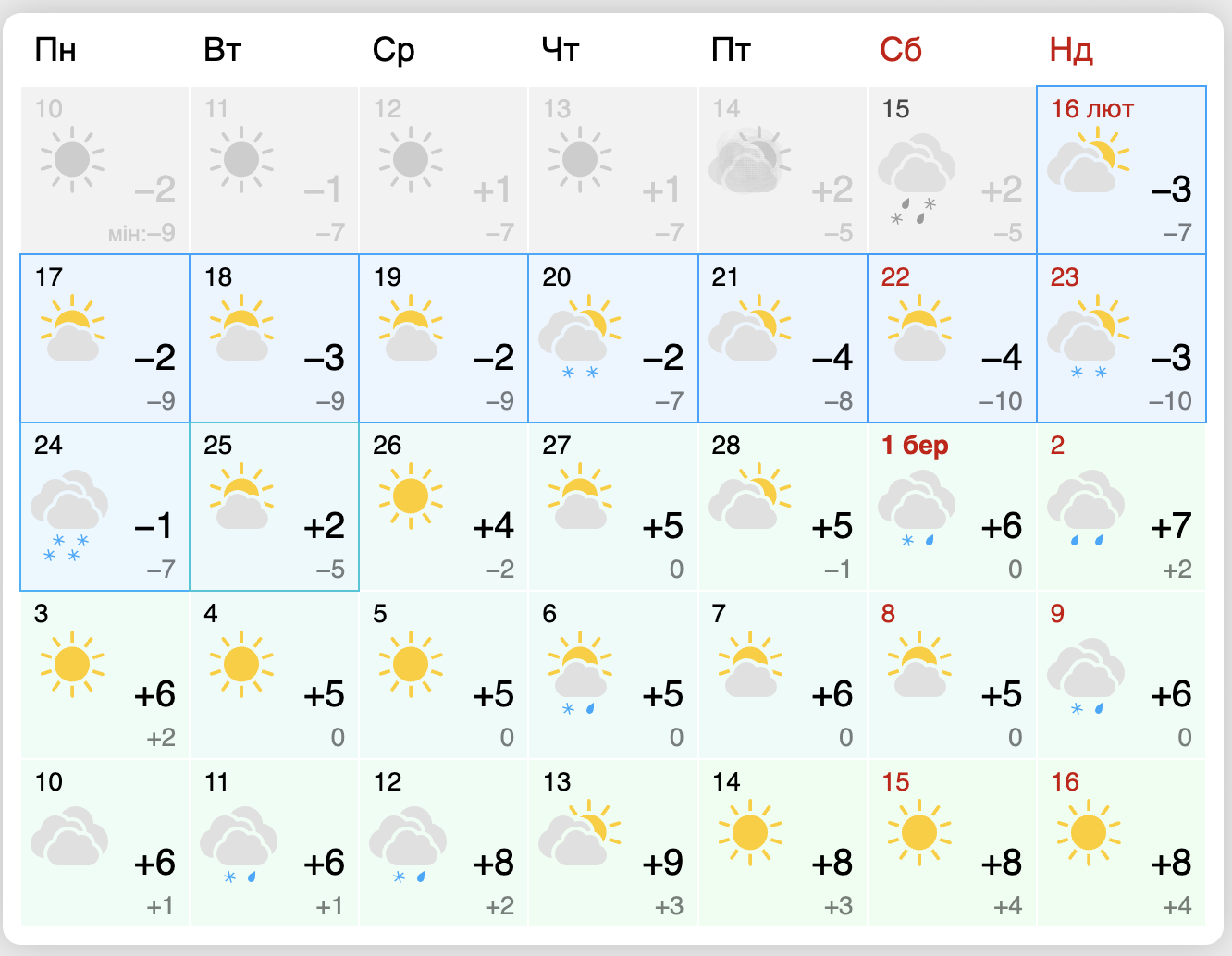 Подниматься температура начнет только с 25 февраля. Из-за облаков выйдет солнышко и столбик термометра будет постепенно подниматься выше нуля.