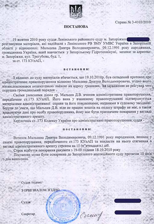 Суд приговорил парня к 15 суткам (Копия судебного решения) Фото http://tsn.ua