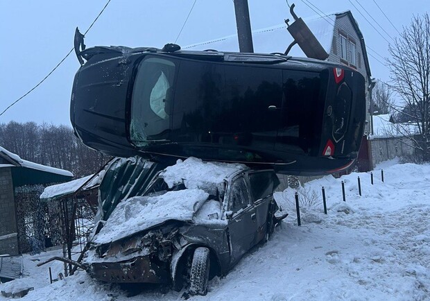 Под Харьковом автомобиль из-за непогоды забросило на крышу другого авто (фото)