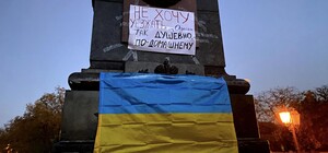 "Не хочу уезжать из Одессы": на Александровской колонне в парке Шевченко появились плакат и флаг Украины